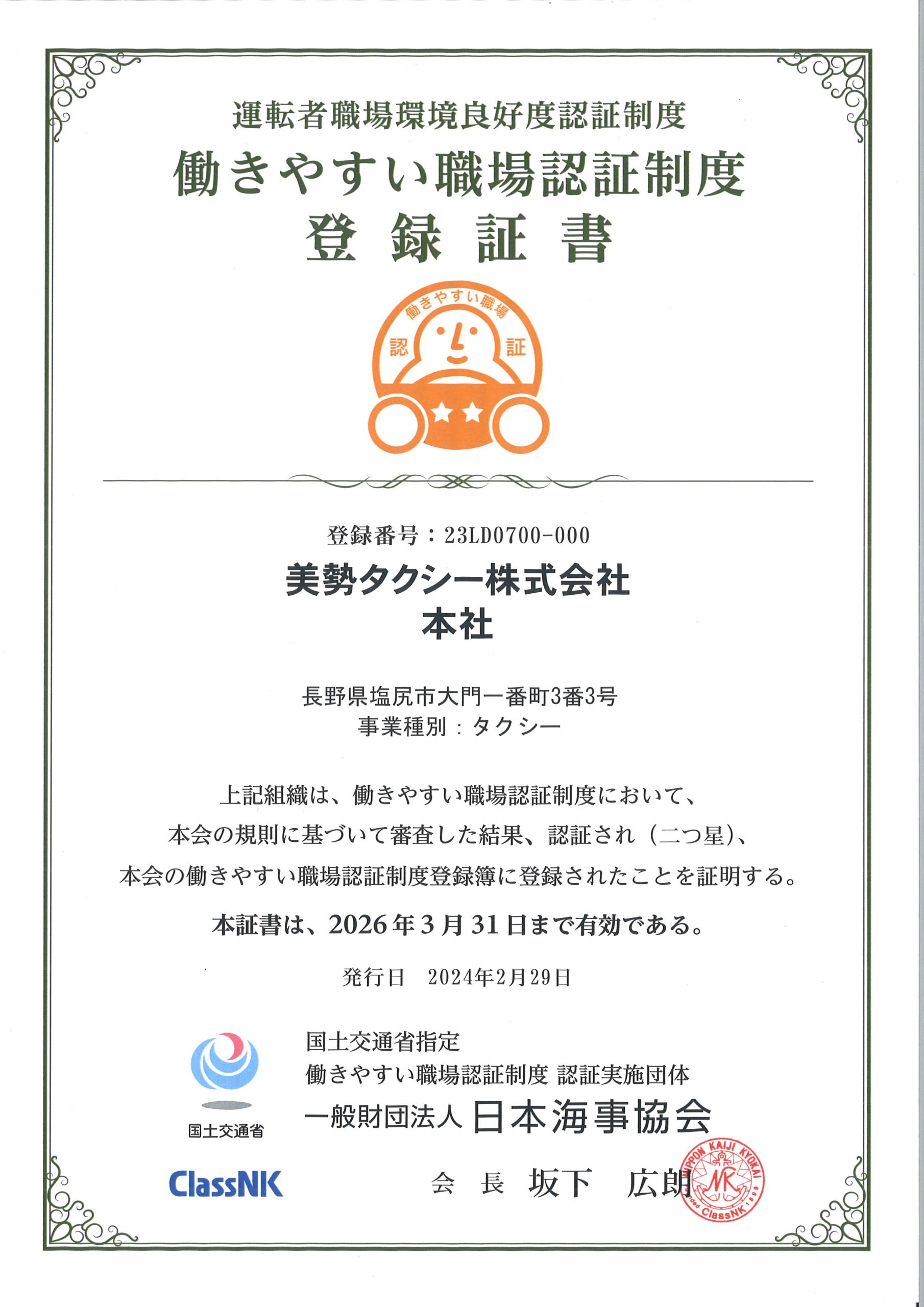 この度、美勢タクシー株式会社は、『働きやすい職場(2つ星)』の職場として認証されました。